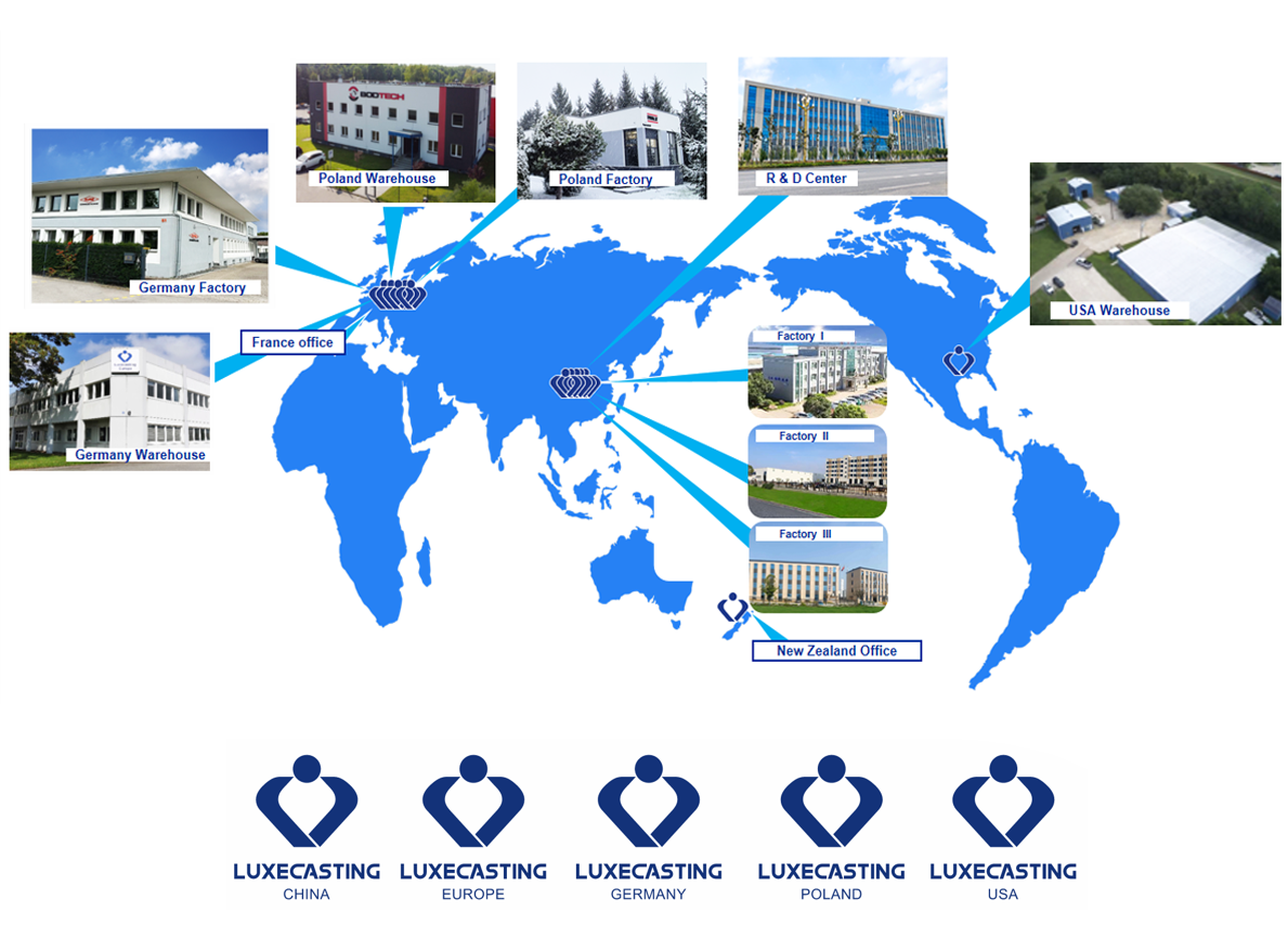 Luxecasting employs nearly 880 people worldwide and operates through a strong international network. The Group runs R&D, manufacturing and warehousing facilities in Germany and Poland, sales offices in France and New Zealand, and a logistics and distribution center in the United States. Supported by long-term partnerships in more than 72 countries, Luxecasting combines a global activity with local responsiveness.